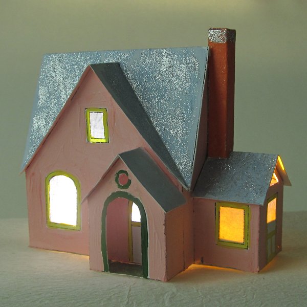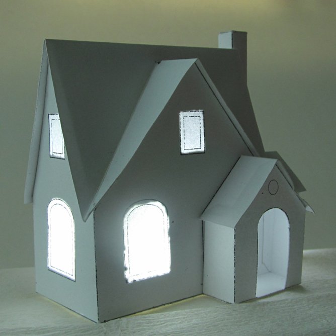 Изделие из плотного картона. Используйте для разукрашивания и в композициях. Имеет светодиодную подсветку окон.